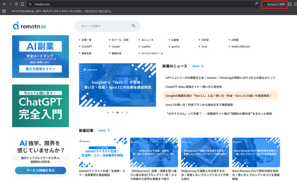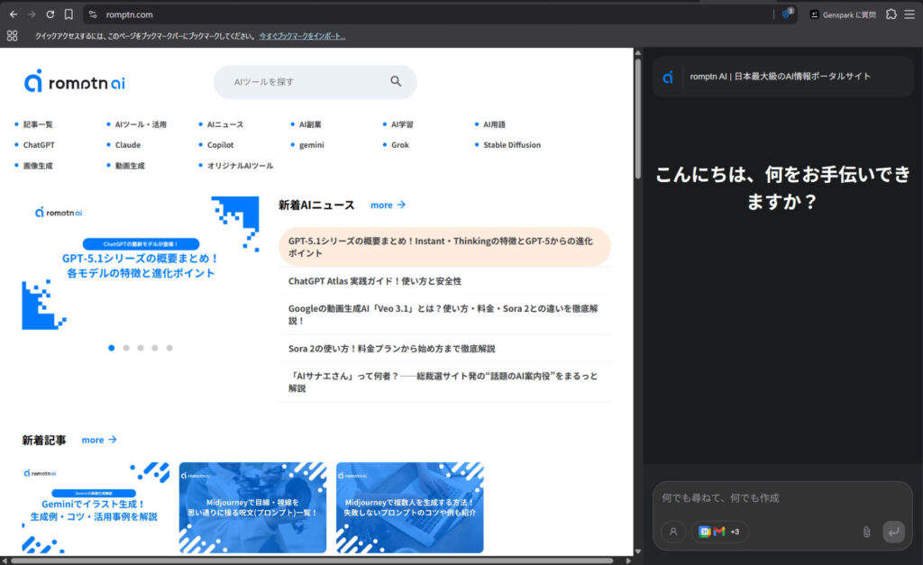 画面右上の「Gensparkに質問」をクリックすることでブラウジングコンパニオンを呼び出します。