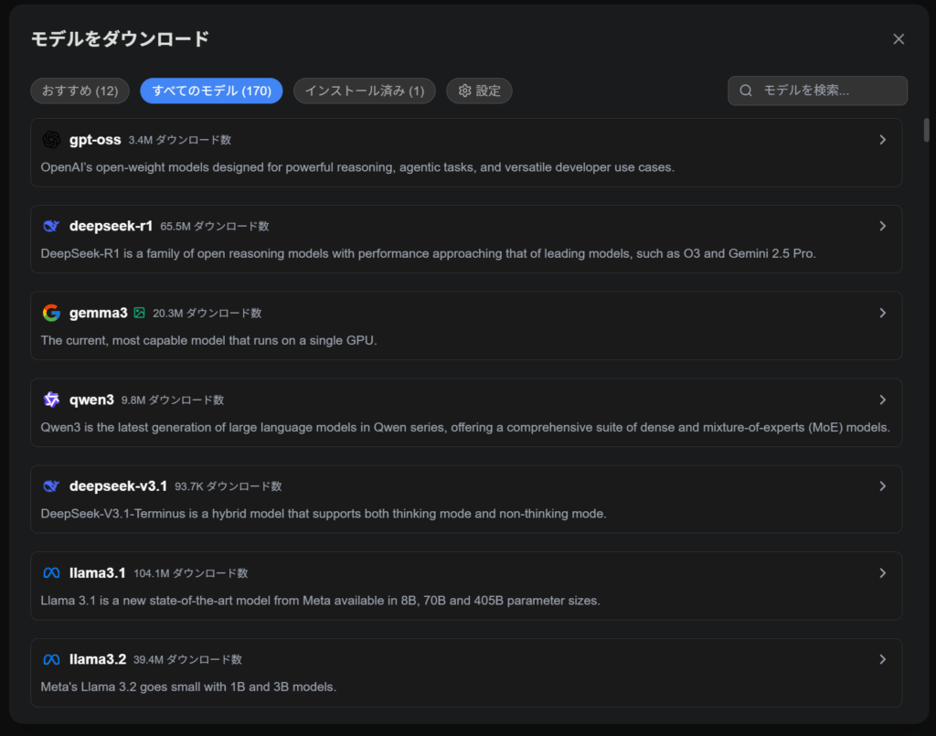 オンデバイスAIは、インターネット上のクラウドサーバーではなく、自身のパソコン(ローカル環境)でAIモデルを動作させる機能です。ローカル環境で使用するAIモデルは、ChatGPTやGemini、DeepSeekを始めとする170種類から選ぶことができます。