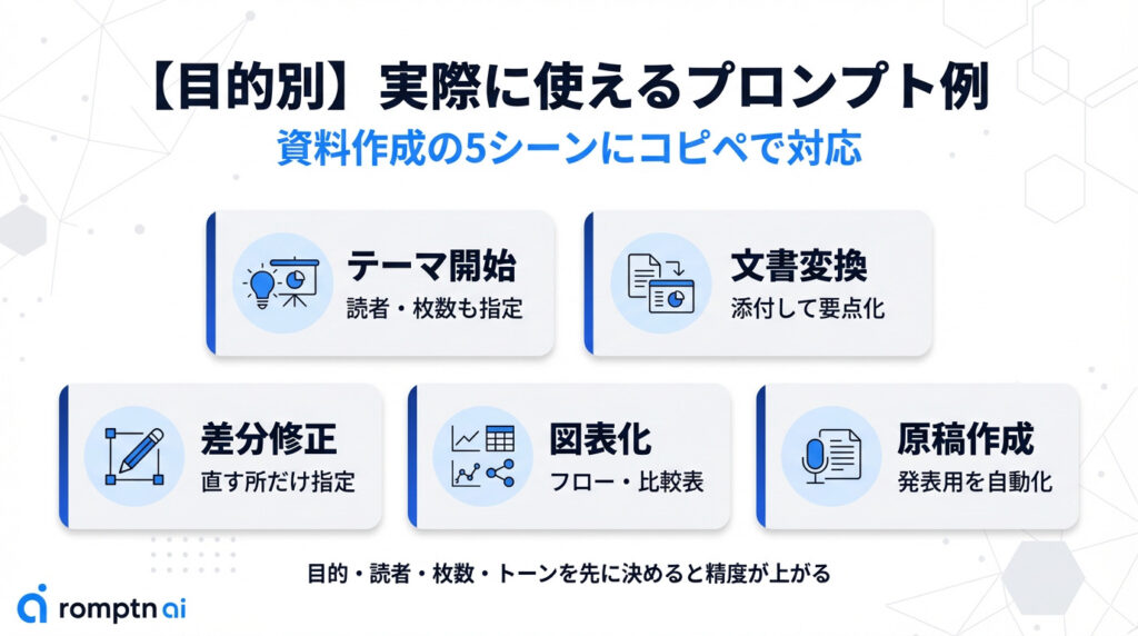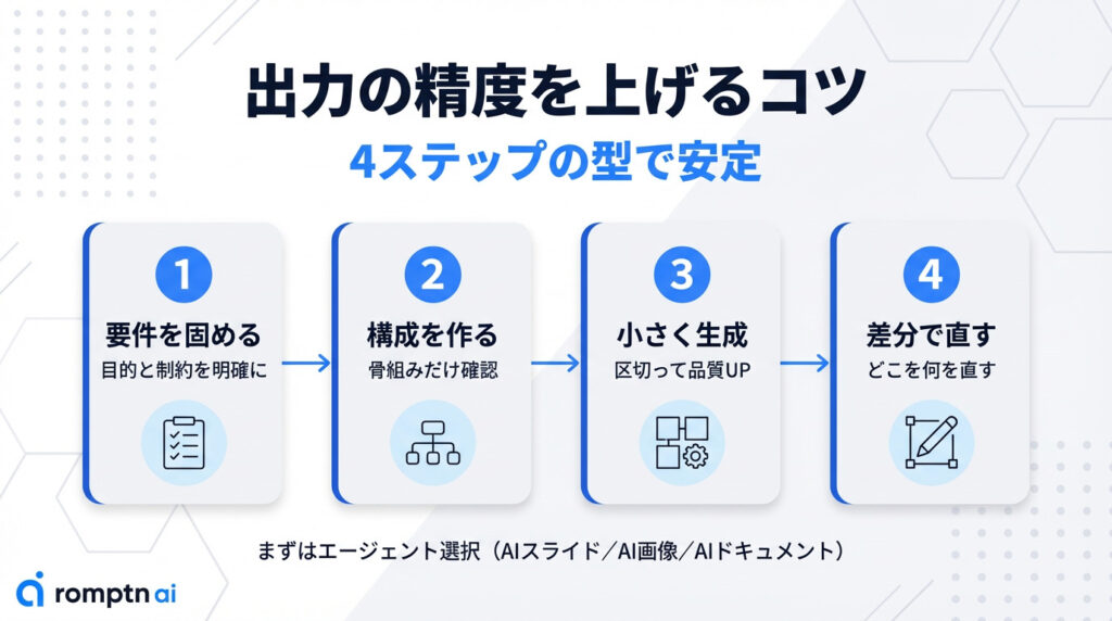 • 出力の精度はプロンプトで決まりやすいので、まず目的・読者・前提・枚数・ルールを固定する