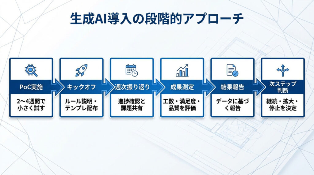 目的:生成AI導入を「小さく試して→評価して→展開する」流れを一目で伝える