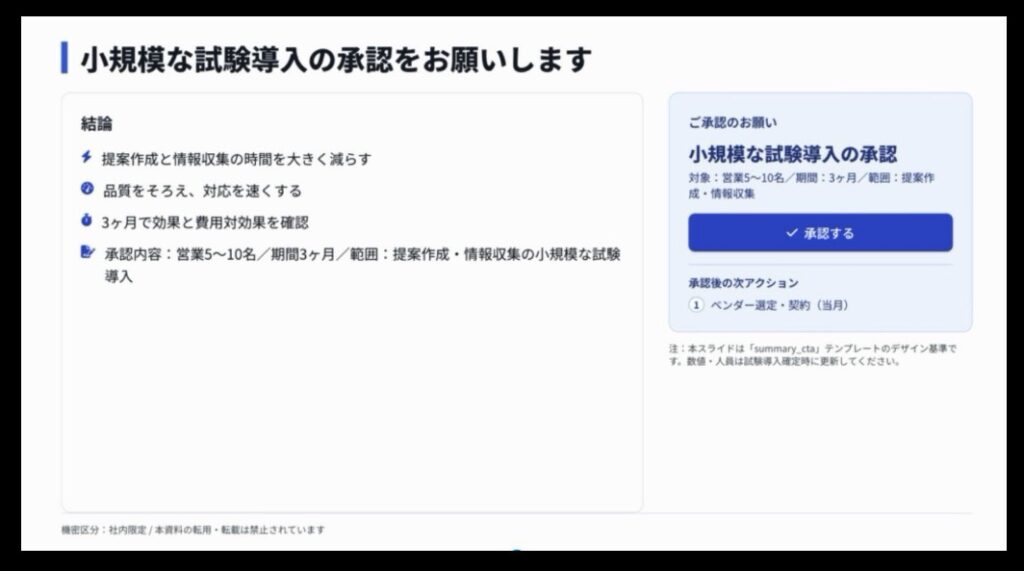 最後に、締めの一言(次アクション=PoC実施の承認依頼)も入れてください。