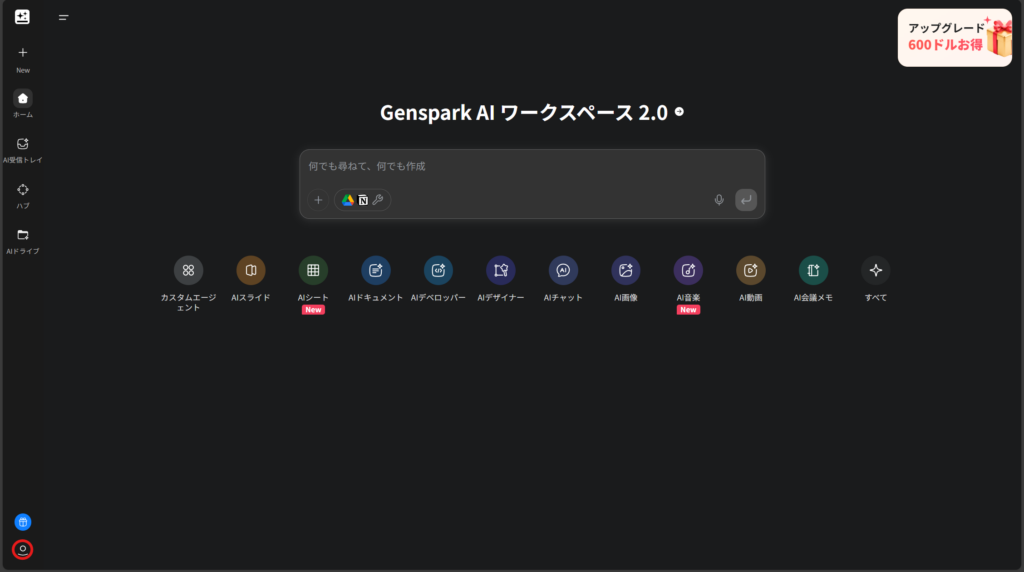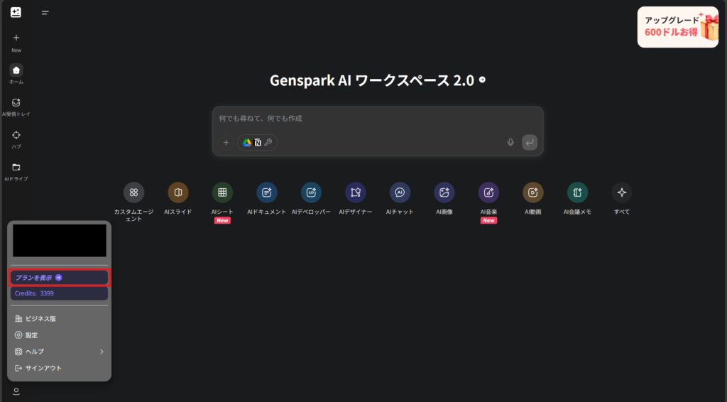 公式Webサイト(https://www.genspark.ai/)にアクセスします。すでにログインしている場合は、以下のような画面が表示されます。ログインしていない場合は、登録したメールアドレスとパスワードを入力してサインインしてください。