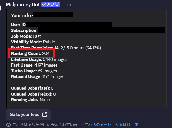 評価の進捗は、Rank Imagesページの右上に表示される「Ranking count」で確認できます。また、Discordでも定期的に /info コマンドで確認して、目標の回数に達しているかチェックしてみてくださいね。