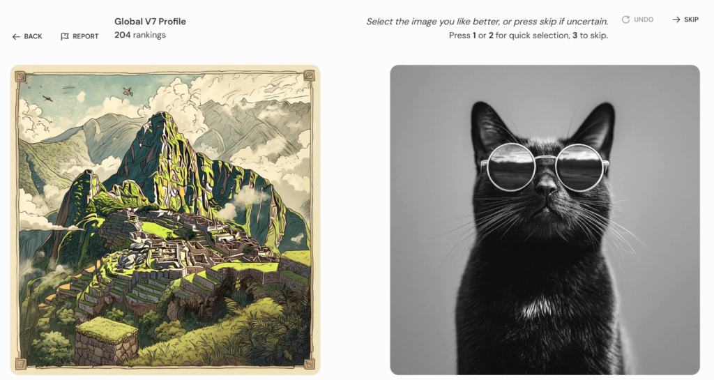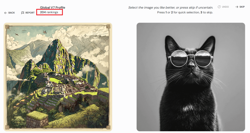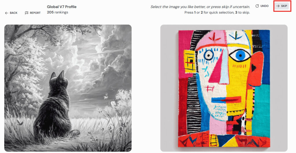 「どちらも微妙だな…」と思ったら、迷わずスキップボタン(ショートカットキー「3」)を使いましょう。曖昧な選択をするより、はっきりと好みが分かる画像だけを評価する方が効果的です!