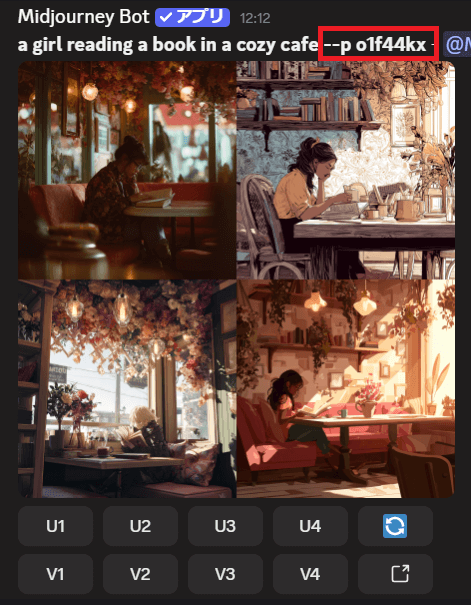 Discord版では、通常通りプロンプトを入力し、末尾に --p を追加しましょう。毎回手動で入力する必要があるのが少し手間がかかります。