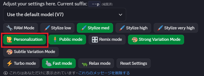 personalization機能を使うには、プロンプトの最後に「–p」を追加するだけです。