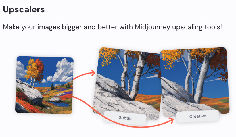 つまりアップスケールは、Midjourneyでの画像生成ワークフローにおける「仕上げの最終工程」として位置づけられる機能です。次のセクションでは、Subtle・Creativeの2種類の違いについて詳しく解説していきます。
