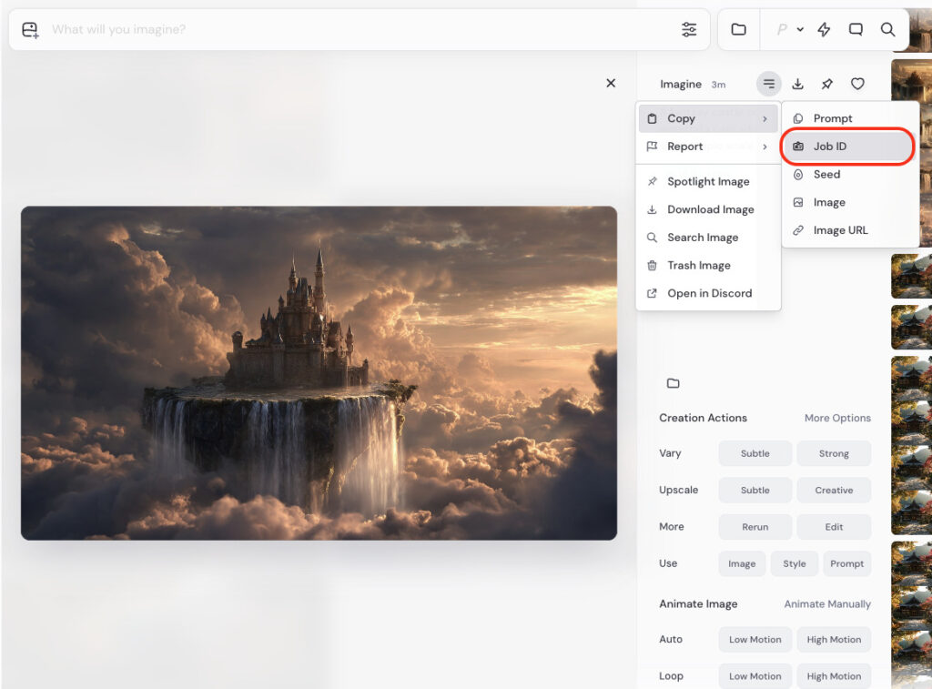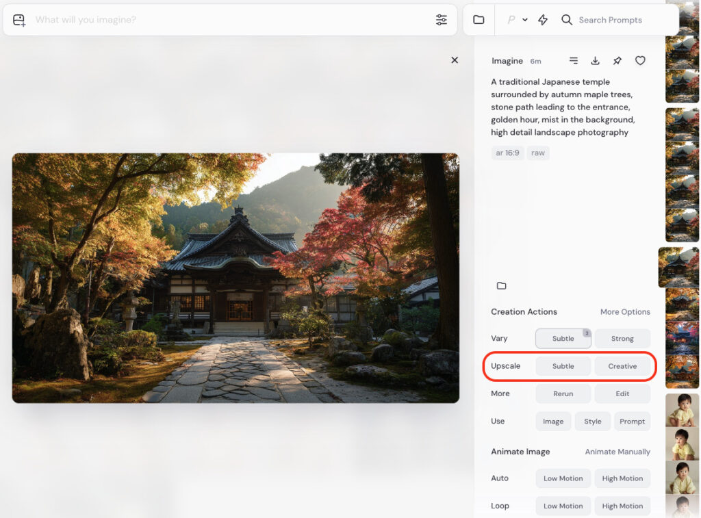 • Web版 → 「Creation Actions」から Upscale (Subtle) または Upscale (Creative) を選択