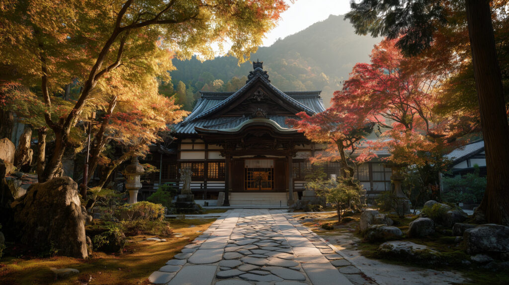 A traditional Japanese temple surrounded by autumn maple trees, golden hour --ar 16:9 --v 7