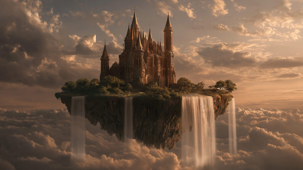 A fantasy castle on a floating island, waterfalls cascading into clouds, golden sunset, epic scale, cinematic lighting --ar 16:9 --niji 7