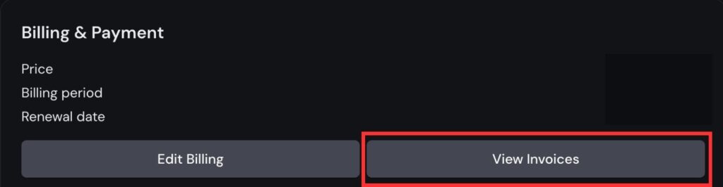 その中に「Billing & Payment」という項目があるので、右下の「View Invoices」を選択すると、支払い情報の画面に移動し、請求内容や領収書の履歴が表示されます。