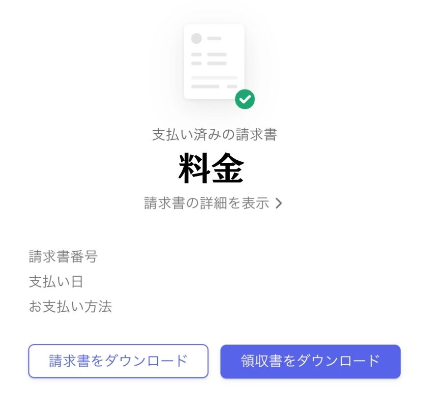 選んだ請求書の詳細ページを開くと、金額や支払い方法などの情報が表示され、その中に領収書、請求書のダウンロードボタンがあります。
