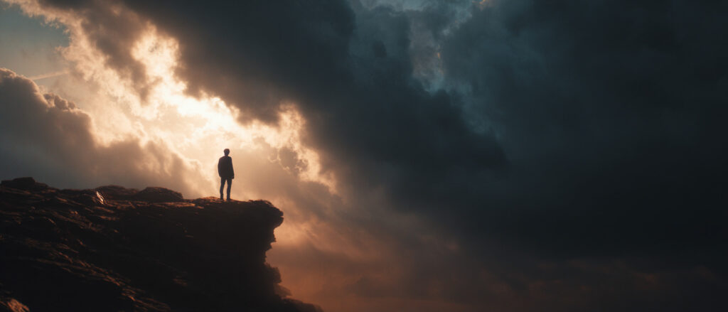 cinematic scene, hero standing on cliff, extreme low angle shot,