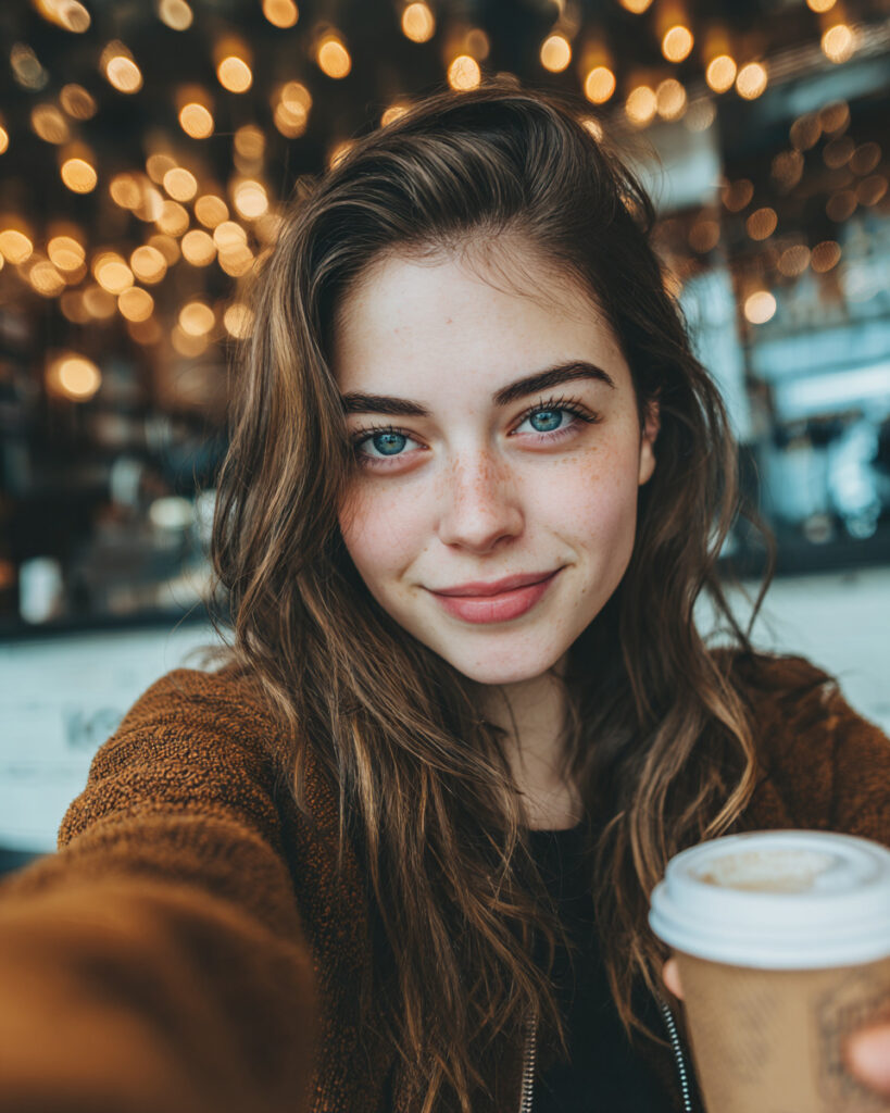 ✕ woman sitting in cafe, beautiful bokeh, low angle shot