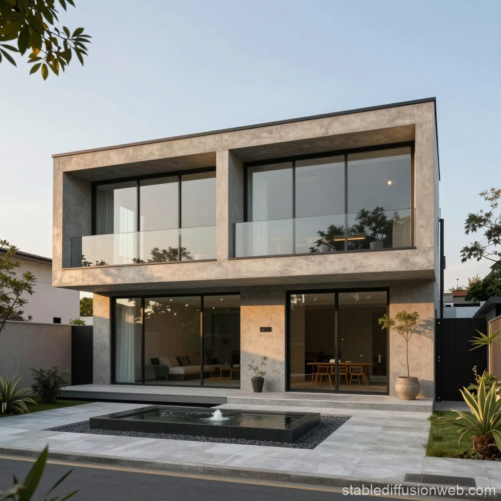 (best quality, masterpiece:1.2), two-story modern house, exposed concrete and glass facade, small courtyard with water feature, golden hour, front perspective, architectural visualization, photorealistic, 8k