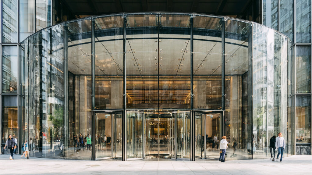 modern office building entrance, glass revolving door, a few people walking for scale, street level view, daytime, architectural photography --ar 16:9