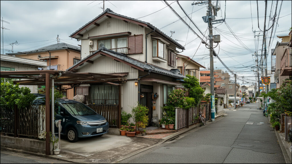 compact two-story Japanese house, narrow residential street, fiber cement siding, small carport, utility poles, overcast sky, suburban Tokyo atmosphere, eye-level street photography --ar 16:9