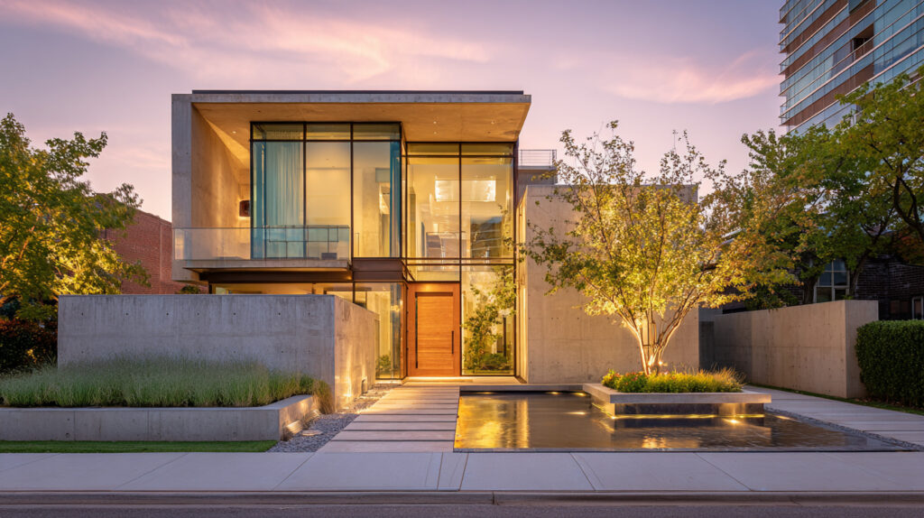 two-story modern house, Tadao Ando inspired, exposed concrete and glass facade, small courtyard with water feature, golden hour lighting, front angle view, architectural photography --ar 16:9