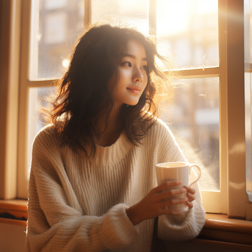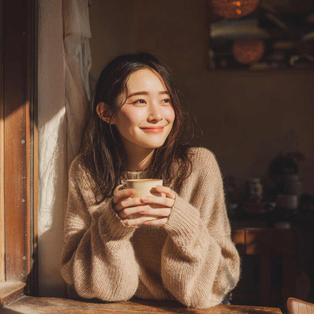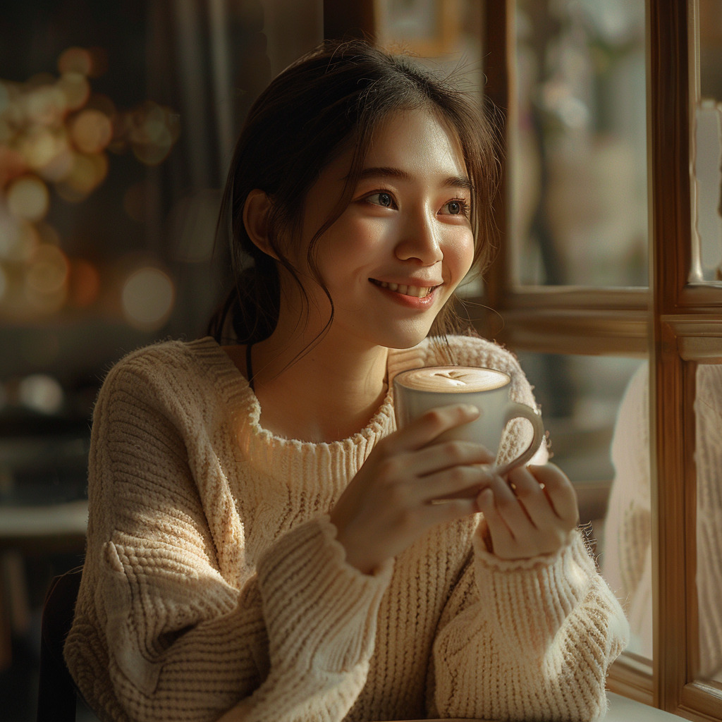A Japanese woman in her late 20s sitting at a cozy cafe by the window, holding a warm latte with both hands, soft afternoon sunlight filtering through, natural smile, casual beige sweater, bokeh background, photorealistic, warm atmosphere --v 7