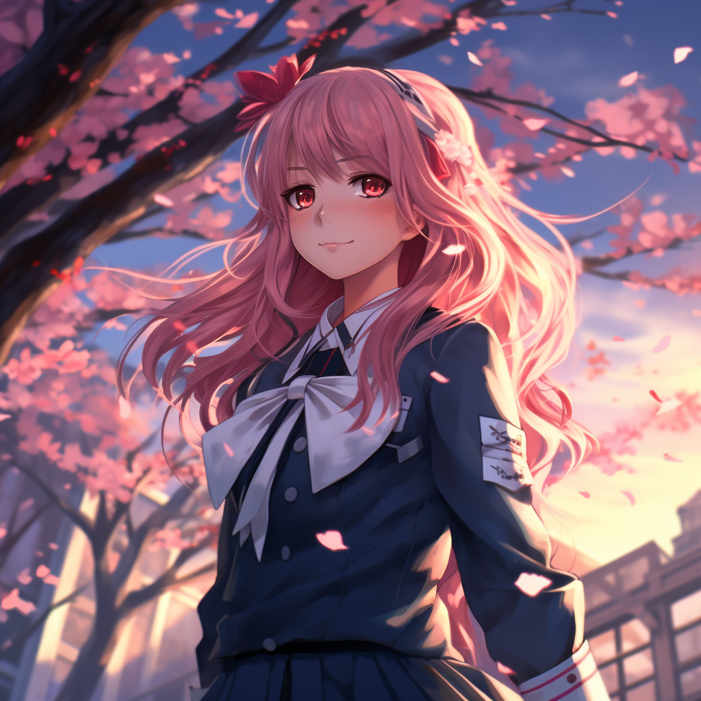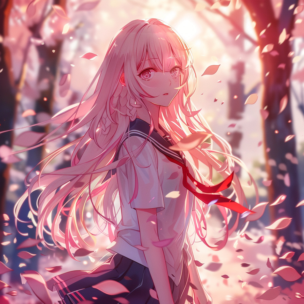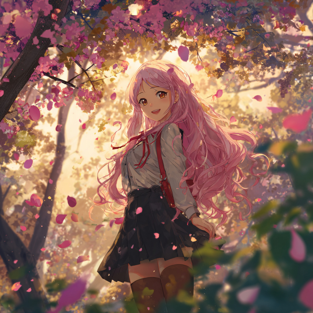 Anime girl with long flowing pink hair, wearing a school uniform with a red ribbon, standing in a cherry blossom garden during sunset, petals falling around her, magical atmosphere, soft pastel colors, detailed eyes, gentle smile, fantasy style