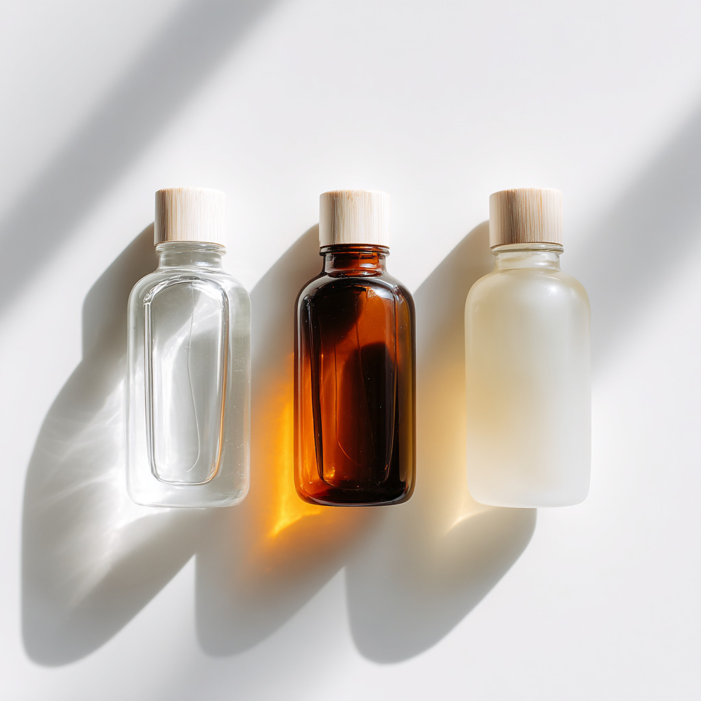 a product photo of three skincare bottles placed side by side on a clean solid white background, front facing, left bottle is fully transparent, middle bottle is dark amber brown, right bottle is milky semi translucent white, each bottle the same height, soft neutral studio lighting, no props, clinical documentation style --v 7 --style raw