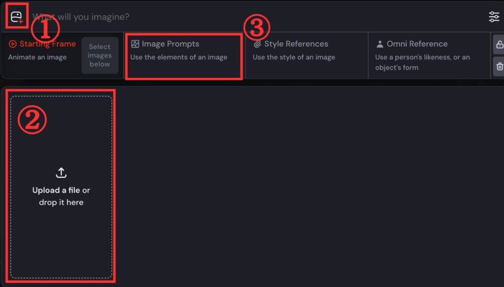 プロンプト左横にあるマークを押して、画像をアップロードする。