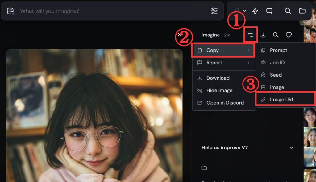生成画像を開き、右上にある「三本線アイコン」をクリックします。① 画像右上の「三本線アイコン」をクリック