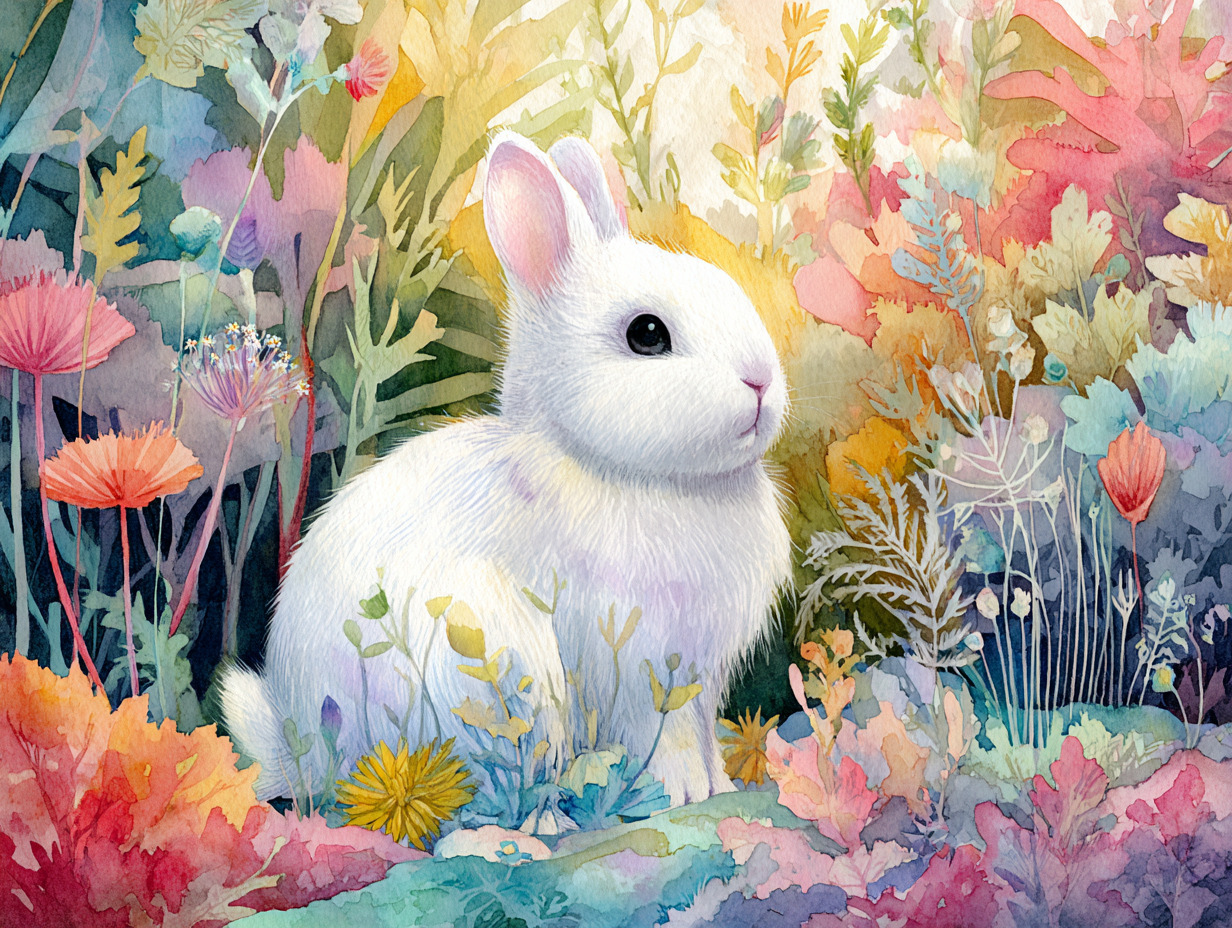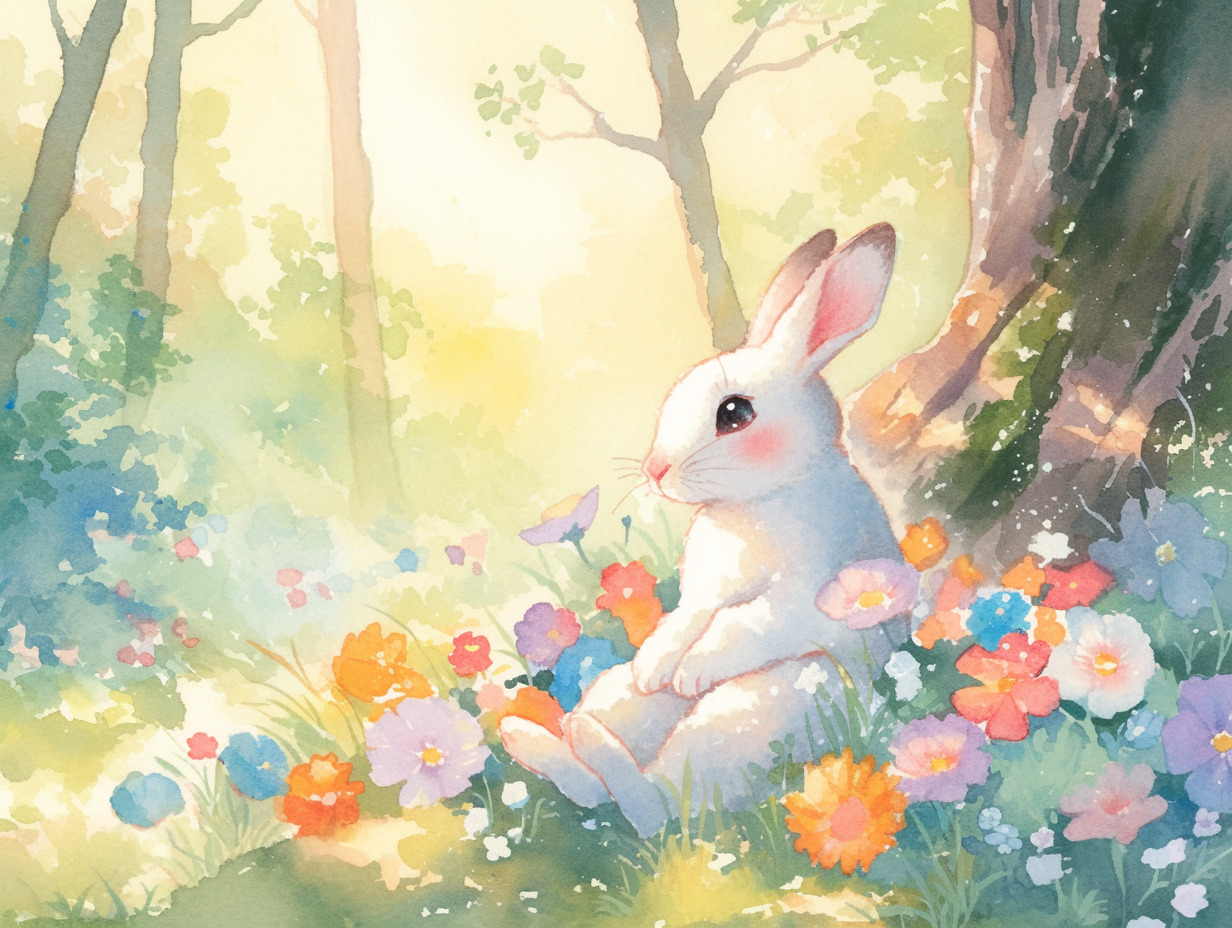 a fluffy white rabbit sitting in a sunny forest, surrounded by colorful flowers, watercolor illustration, soft pastel colors, gentle atmosphere, children's book illustration --ar 4:3
