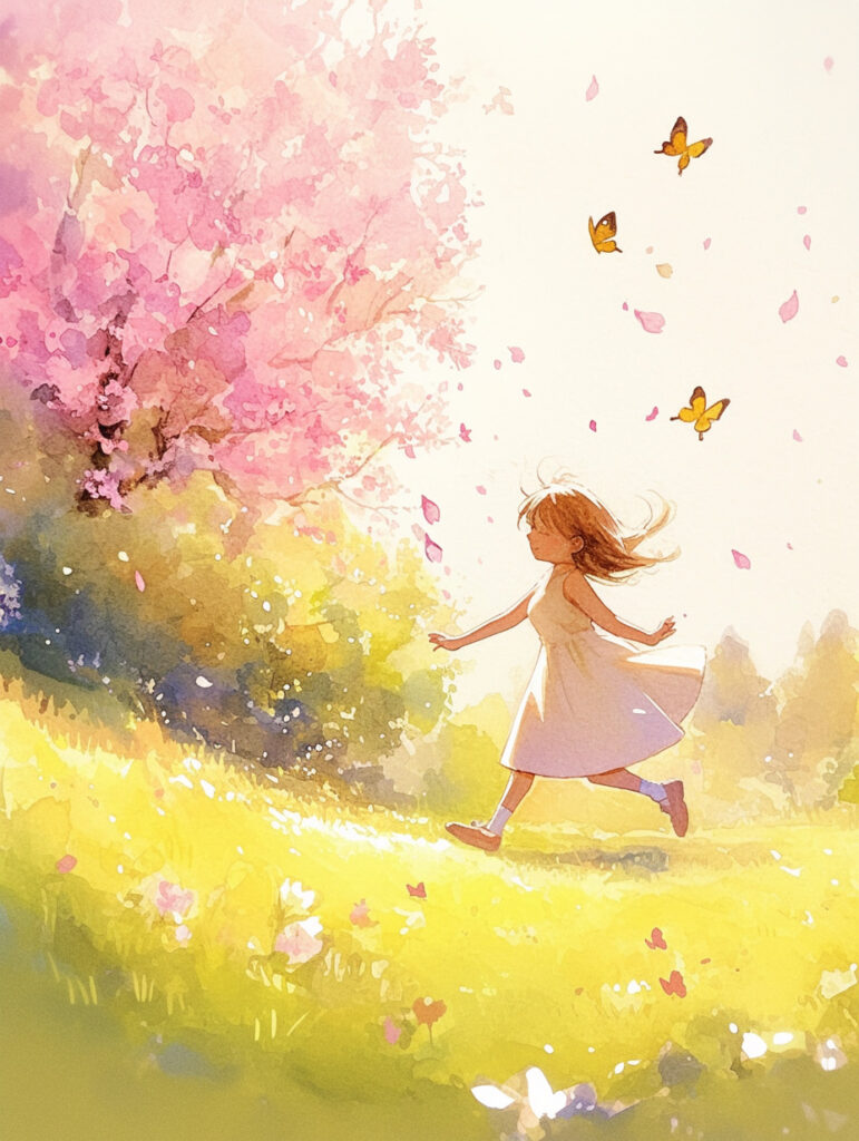 a little girl running through a field of blooming flowers, cherry blossoms floating in the gentle breeze, butterflies dancing around, watercolor illustration, soft spring colors, fresh and cheerful atmosphere, light and airy feeling, seasonal children's book art --ar 3:4 --niji 6