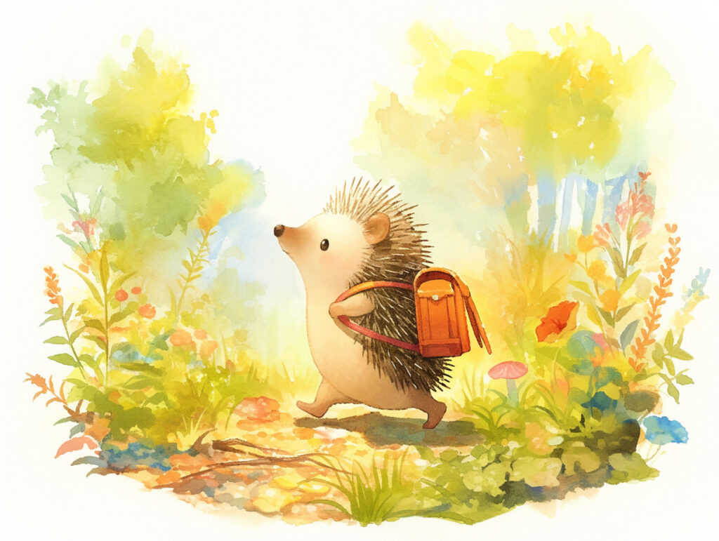 訳:小さなリュックを背負った小さなハリネズミが、日の当たる森を歩いている、水彩画風、柔らかいパステルカラー、温かく優しい雰囲気、児童書イラスト、絵本スタイル