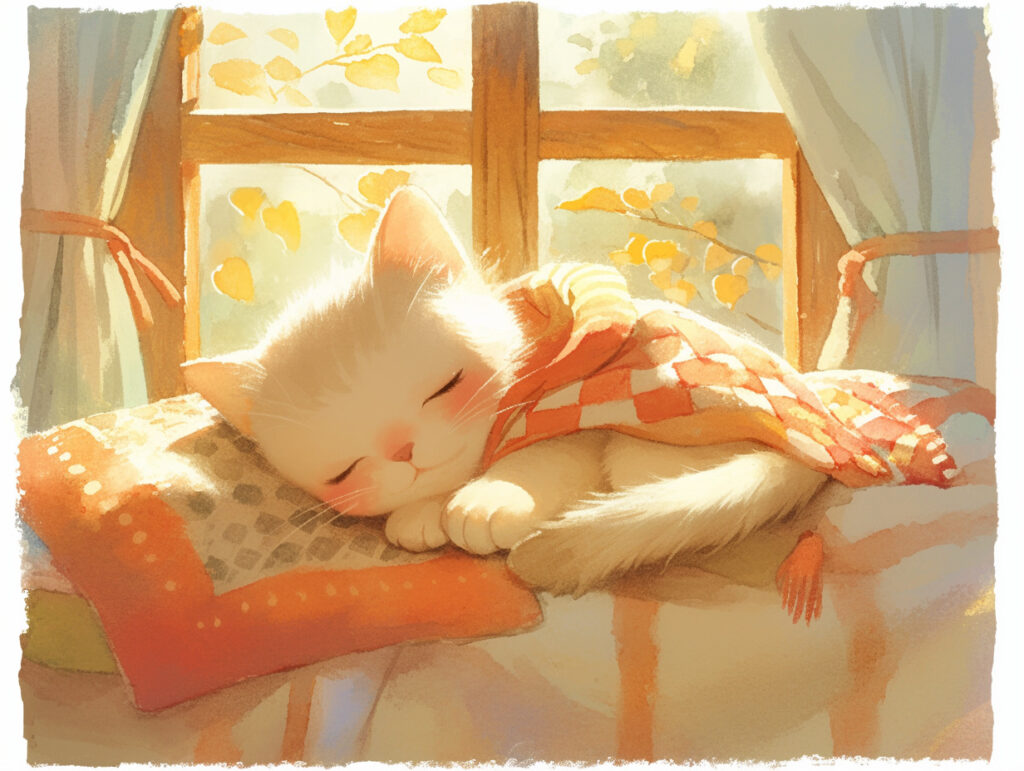 a tiny kitten sleeping peacefully in a soft blanket, warm sunlight through the window, watercolor illustration, soft pastel colors, gentle and cozy atmosphere, tender moment, children's book illustration --ar 4:3 --niji 6