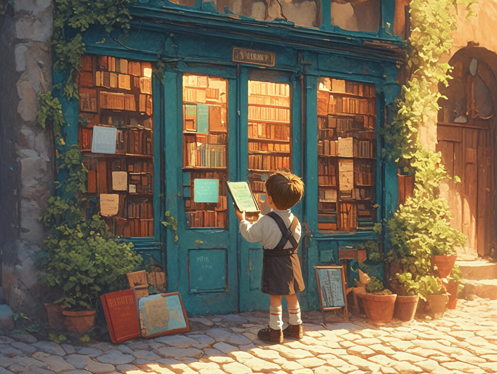 a young boy discovering a mysterious old bookshop on a quiet cobblestone street, vintage shop window with antique books, colored pencil illustration, nostalgic and peaceful atmosphere, muted vintage colors, classic children's book style, soft afternoon light --ar 4:3 --niji 6 --s 250