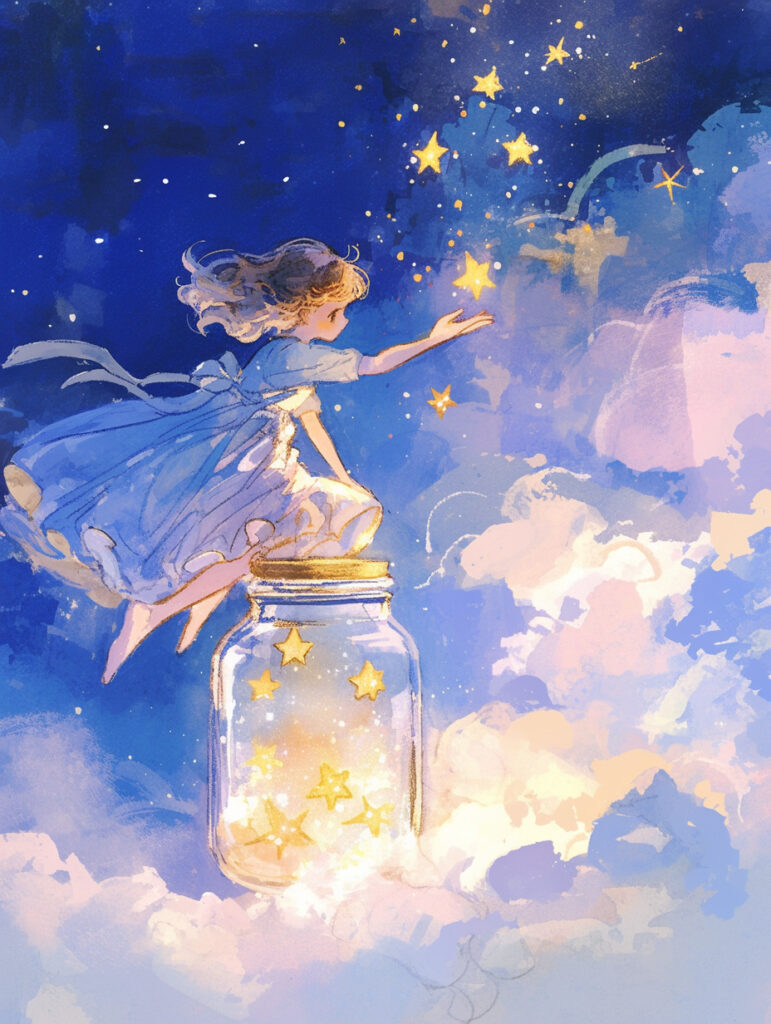 a young girl in a flowing dress collecting fallen stars in a glass jar, floating among clouds in the night sky, watercolor illustration, dreamy and magical atmosphere, glowing stars, soft moonlight, whimsical fantasy, children's storybook art --ar 3:4 --niji 6