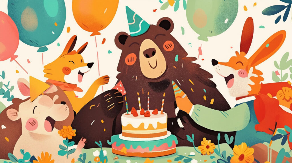 cute animals celebrating a birthday party with balloons and cake, a bear, a fox, and a bunny wearing party hats, flat illustration style, bright vivid colors, playful and cheerful atmosphere, simple and clean composition, modern children's book art --ar 16:9 --niji 6