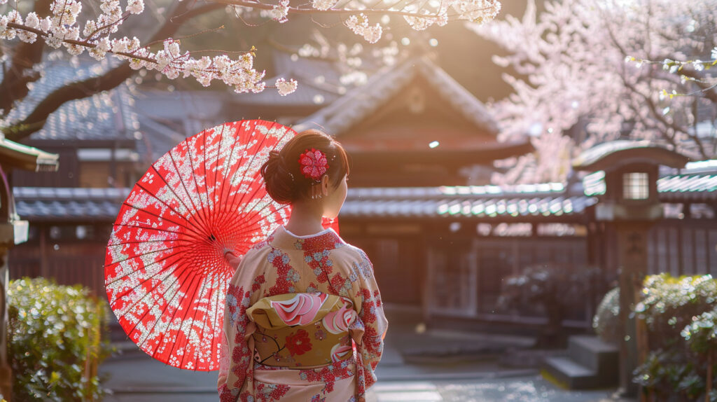 Japanese girl in kimono, cherry blossoms, traditional garden --ar 16:9 --v 6