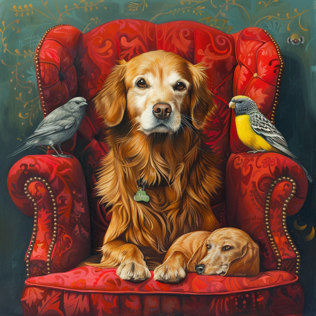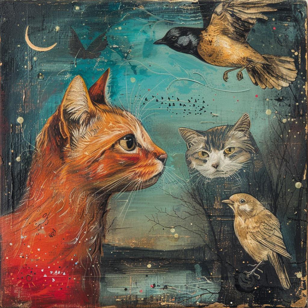 bird, dog, cat --v 6「cat, dog, bird」と記述して生成した最初の画像では、cat が最も強く解釈され、主役として大きく描かれています。