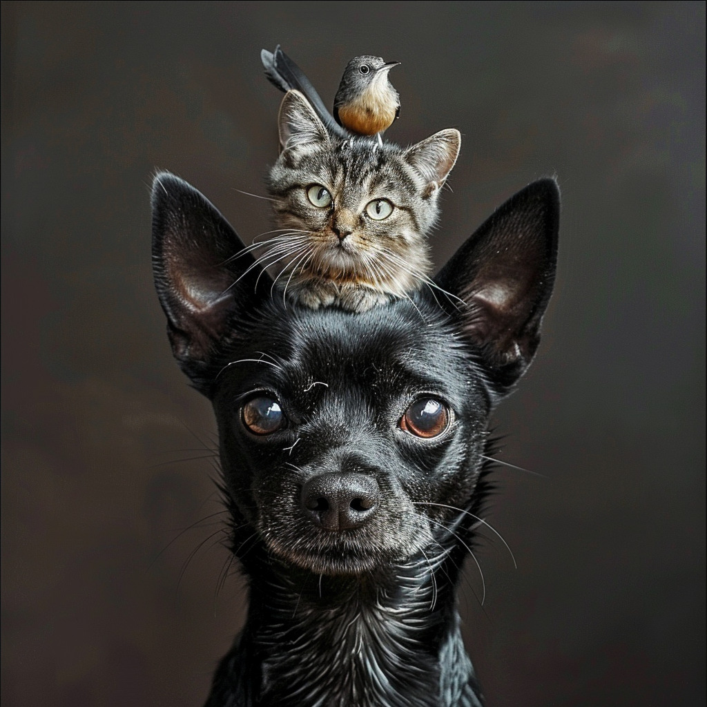 次に語順を「bird, dog, cat」に入れ替えてみると、描かれる要素が大きく変化しました。