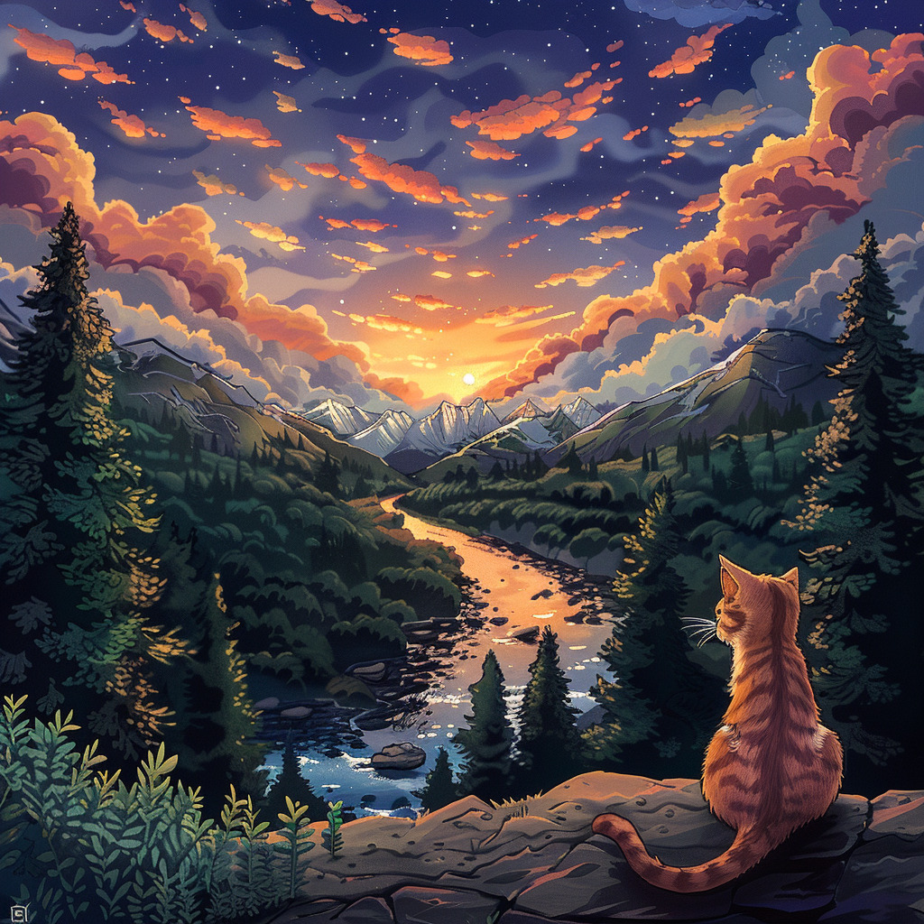 cat, mountains, rivers, trees, clouds, sunset --v 6