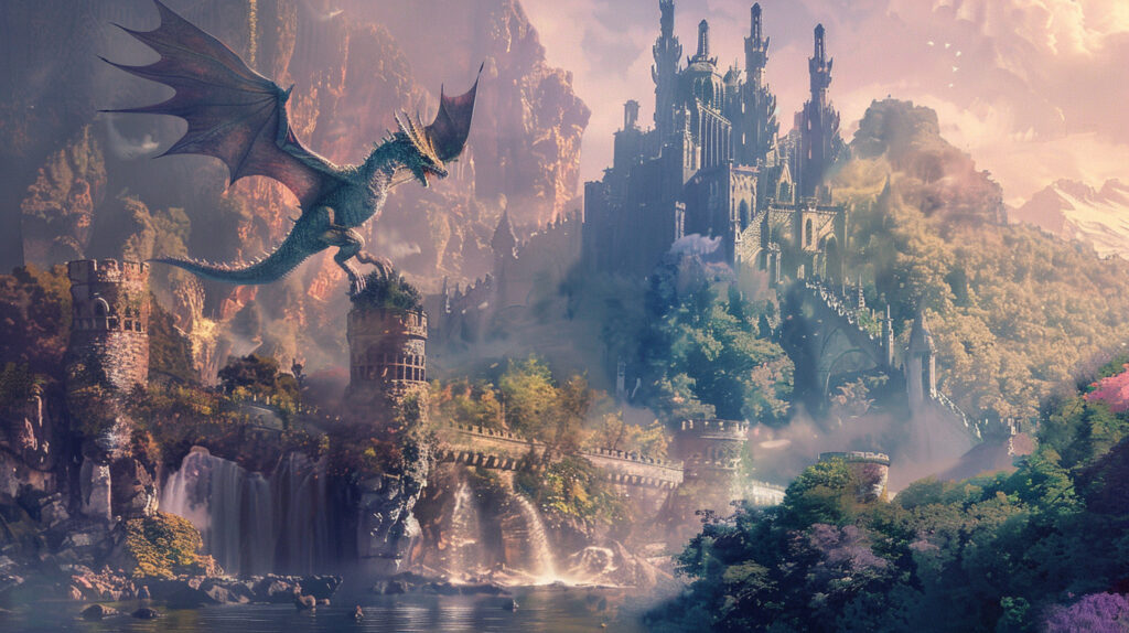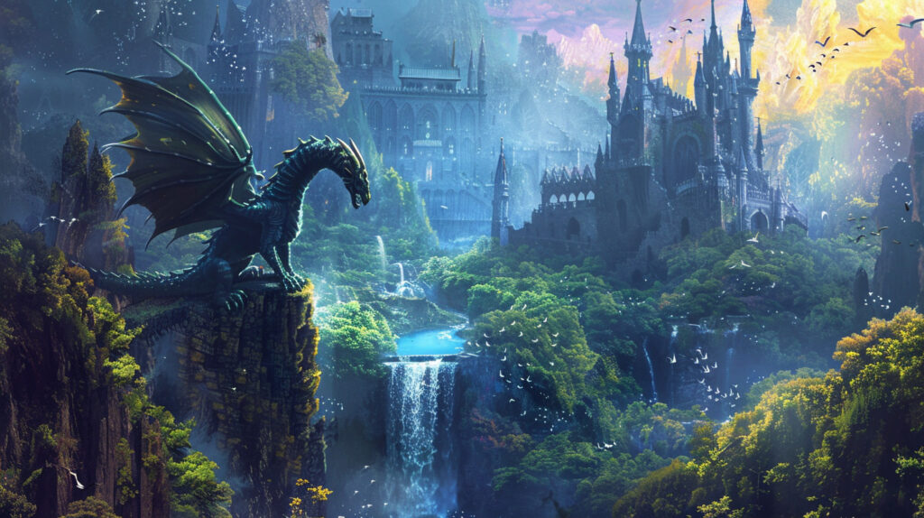 fantasy castle, dragon, magical forest --ar 16:9 --v 6