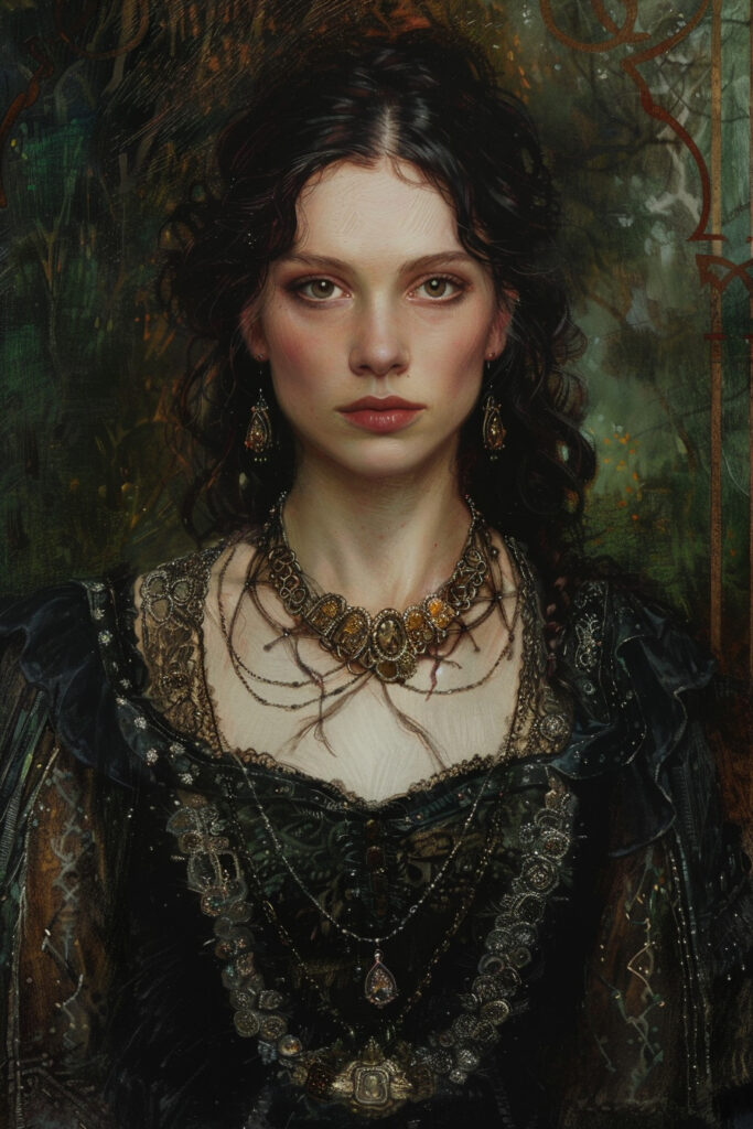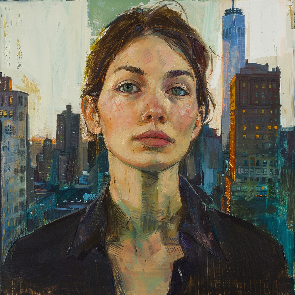 portrait of a woman::3, city background::-0.5 --ar 2:3 --v 6最初の画像では、女性と都市の背景が同じくらいの存在感で描かれています。