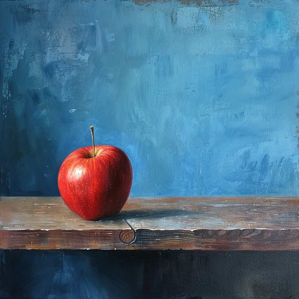 その結果、赤い要素が大きく弱まり、リンゴは描かれなくなり、青い木製テーブルだけが強調される形になっています。