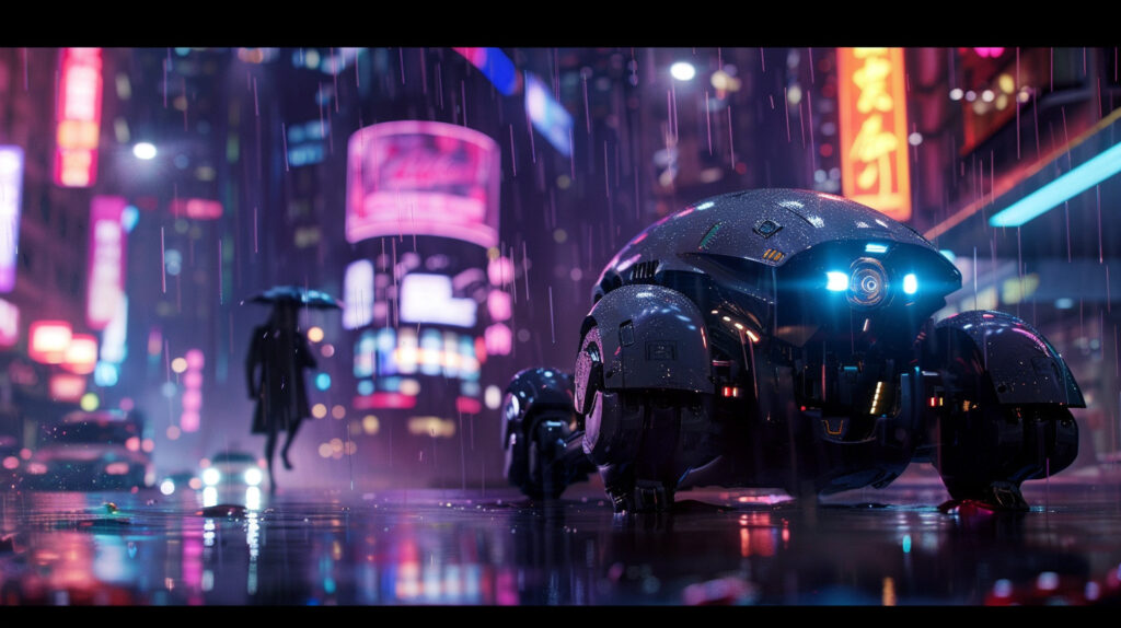 robot::2, neon city::3, rain, night --ar 16:9 --v 6ウェイトなしの画像では、ロボット・ネオン街・雨・夜景といった要素がそれぞれ適度に反映されています。