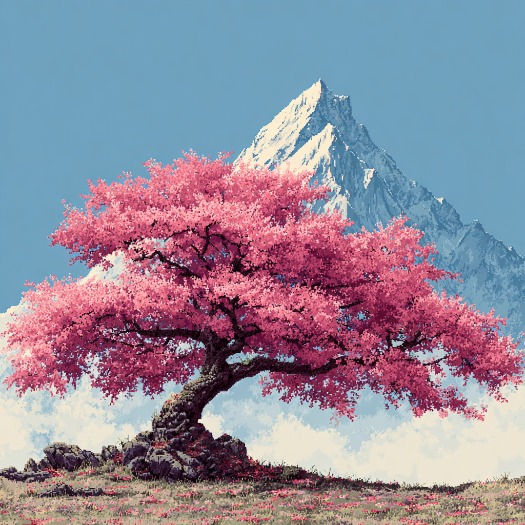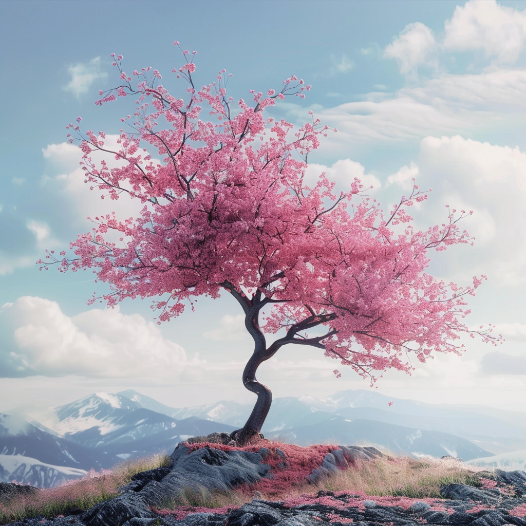 sakura tree::2, mountainウェイトなしの場合は、桜の木と背景の山がどちらも均等に描かれ、全体としてバランスの取れた構図になります。