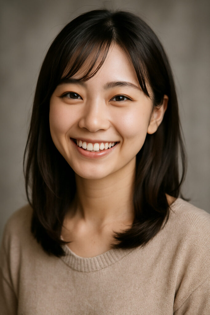 20代の日本人女性のポートレート写真。自然な笑顔で、柔らかいスタジオライティング。背景はボケていて、プロっぽい仕上がりで