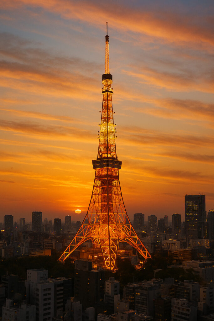 夕暮れ時の東京タワー。ゴールデンアワーの美しい空、街並みも見える写真のようなリアルな画像で