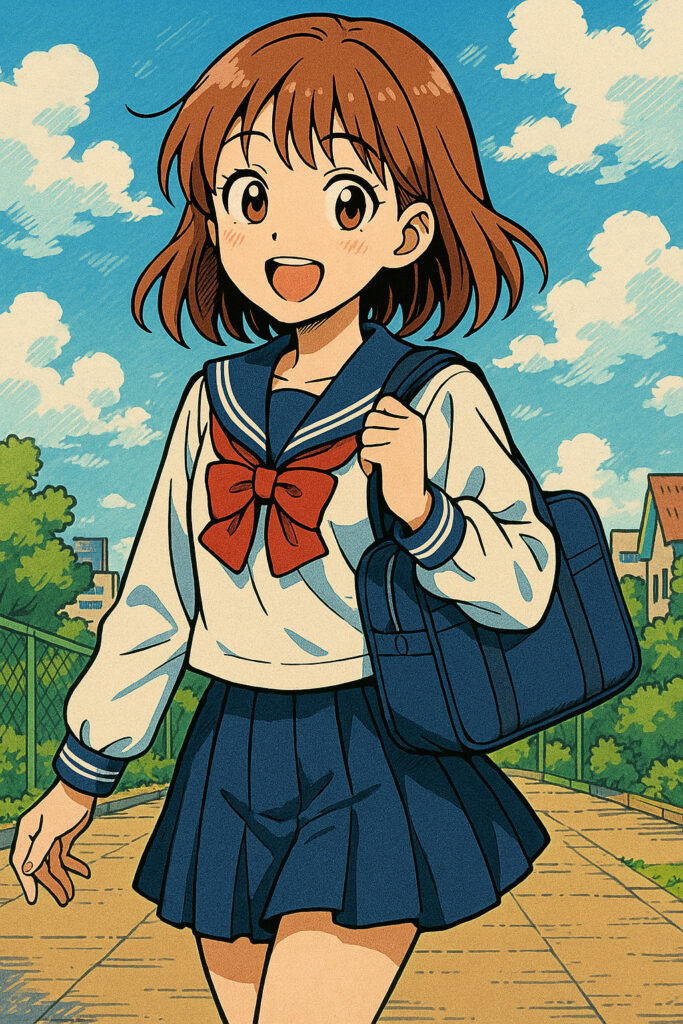Anime style illustration of a high school girl, bright colors, manga style, detailed --niji 6
