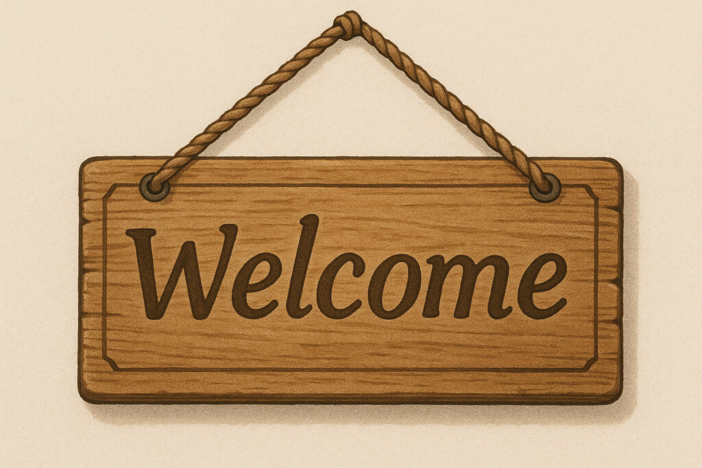 A wooden signboard with the text 'Welcome' written on it, rustic style