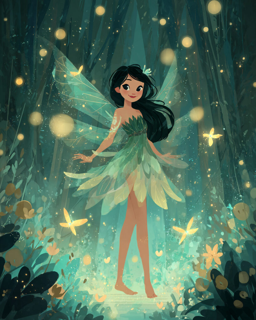 A cheerful forest sprite with leaf-shaped wings, flowing green dress made of petals, barefoot in a magical woodland, surrounded by glowing fireflies, Disney fairy tale aesthetic, gentle smile, pastel color palette, dreamy and magical atmosphere --ar 4:5