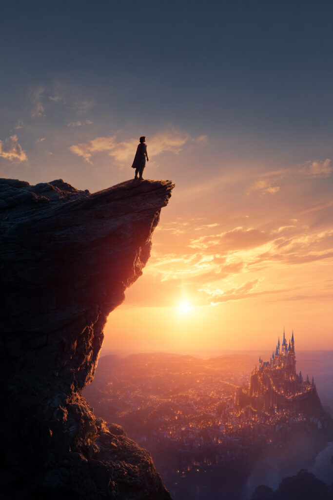 A heroic character silhouette standing on cliff edge overlooking vast fantasy kingdom at sunset, cinematic movie poster composition, dramatic lighting with lens flare, title space at top, Disney animated feature poster style, epic and inspiring mood, theatrical release quality, vertical format --ar 2:3 --q 2