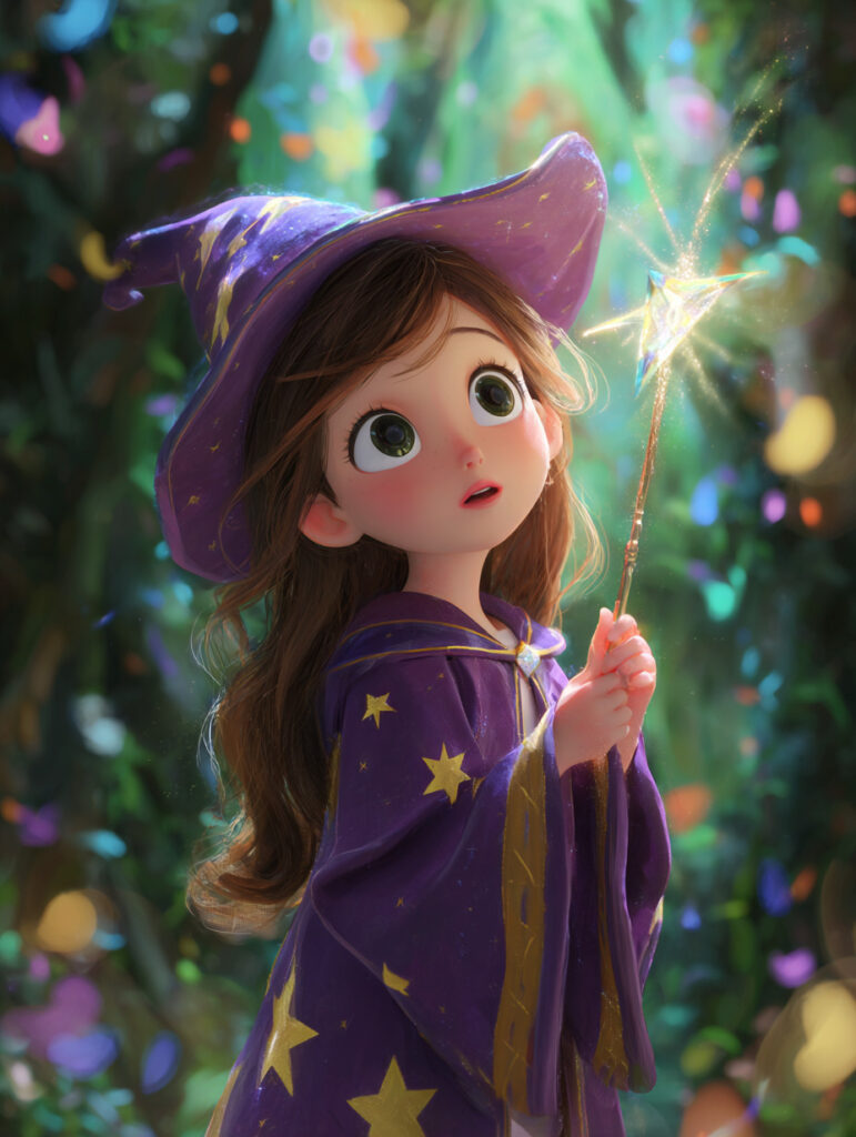 A young magical girl with sparkling eyes, wearing a purple wizard robe with golden stars, holding a glowing crystal wand, Disney animation style, soft lighting, enchanted forest background, colorful and whimsical atmosphere, detailed character design --ar 3:4